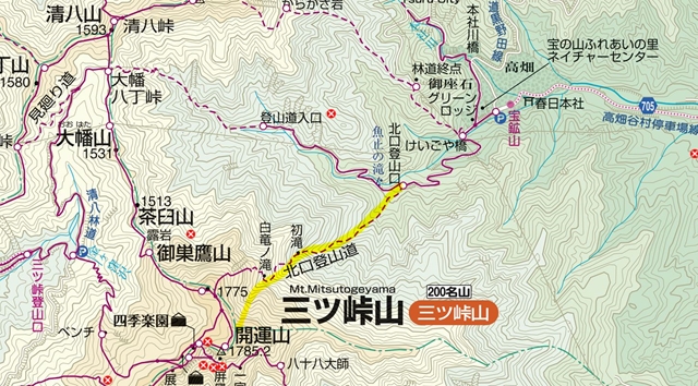 1日目: 富士急行 大月駅7:10頃…宝の山ふれあい駐車場(8時頃)…北口登山道…四十八滝…三ツ峠稜線…北口登山道…駐車場…大月駅(17時頃)