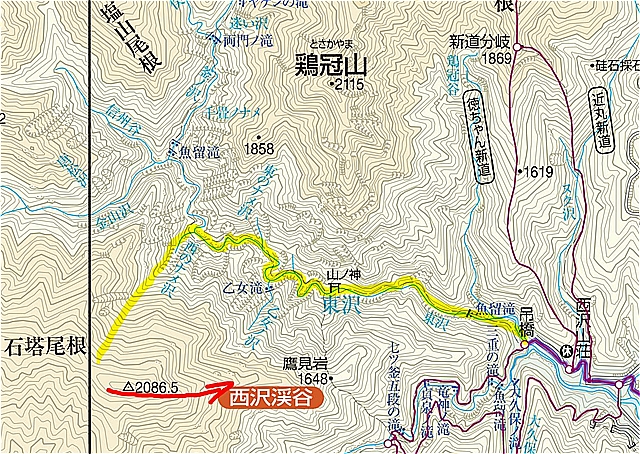 奥秩父の甲武信岳の銘渓、東沢の支流、西のナメ沢を遡行します。西のナメ沢出合いまでのアプローチが長く、下山は石塔尾根を使います。