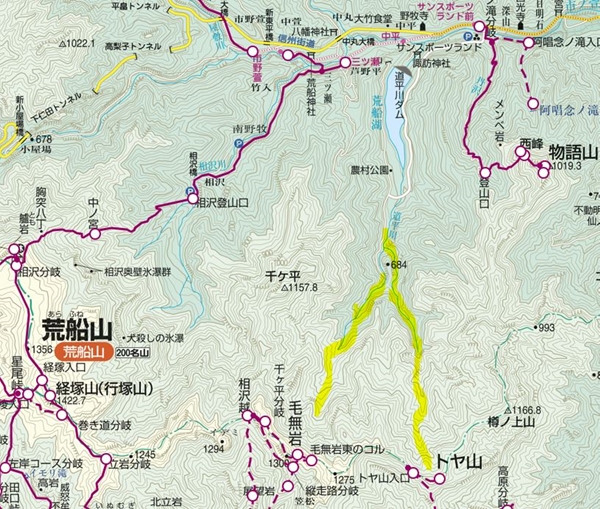 西上州の沢シリーズ 荒船山〜毛無山〜トヤ山の稜線を源流とする道平川は、アプローチ、標高差、グレードともに初級向けの沢となります。今回は左俣を遡行して、右俣から下山。途中林道と合流します。