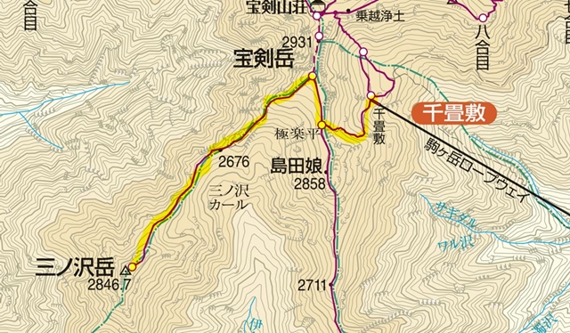 1日目:駒ヶ根駅6:00頃=菅の台バス停6:30集合(始発)=しらび平…極楽平…最低コル→三ノ沢岳(2847m)→極楽平…千畳敷15:00頃=菅の台16:30頃=駒ヶ根駅